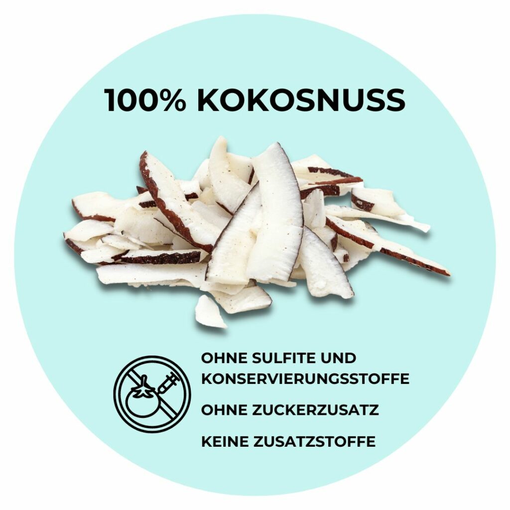 Unsere getrockneten Kokosflocken sind frei von jeglichen Zusatzstoffen oder Konservierungsmitteln. Das Produkt besteht zu 100% aus Kokosnuss, sonst nichts. Bei jedem Bissen nichts als eine Explosion von Frische und Knusprigkeit.