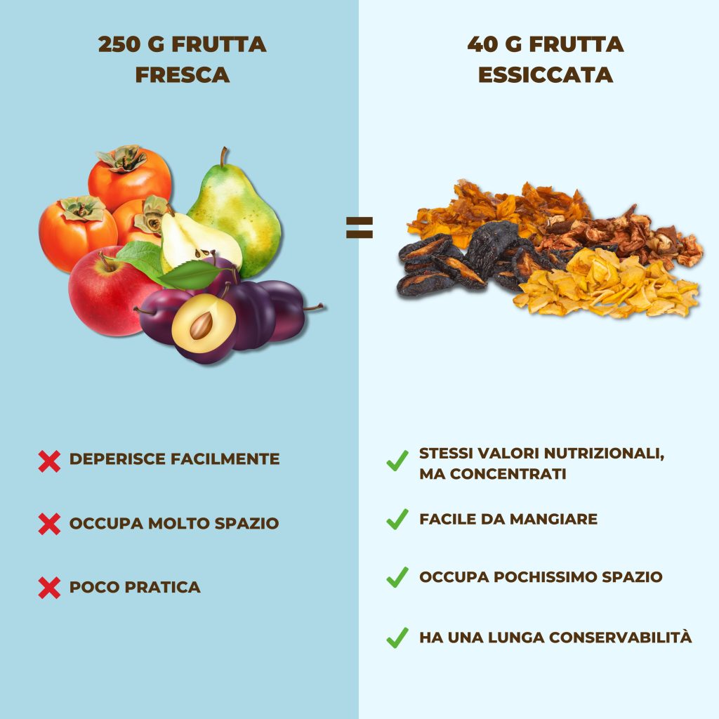 Al suo interno troverai Cachi, Mele, Pere e Prugne essiccate lentamente a bassa temperatura.