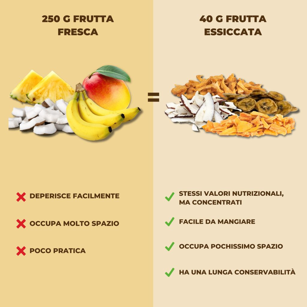 La frutta essiccata è la risposta: mantiene i principali valori nutrizionali della frutta fresca, ma in una forma più concentrata e comoda da gustare.