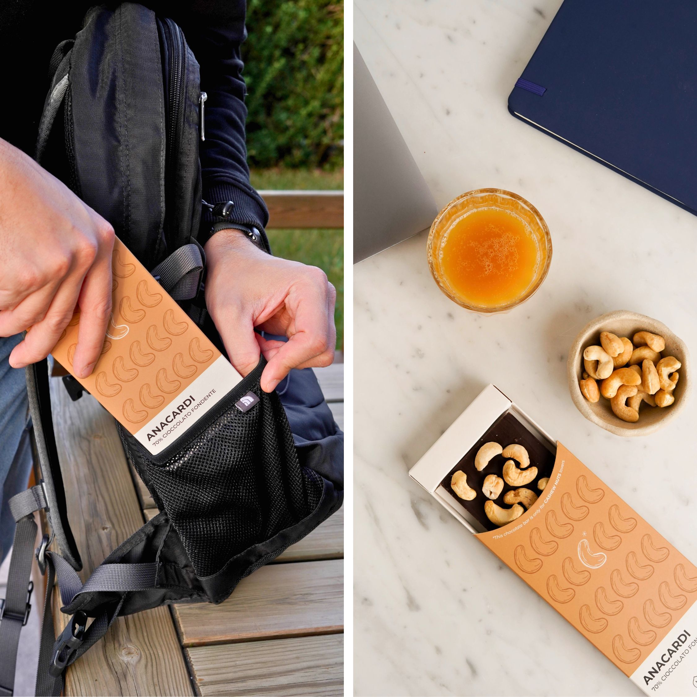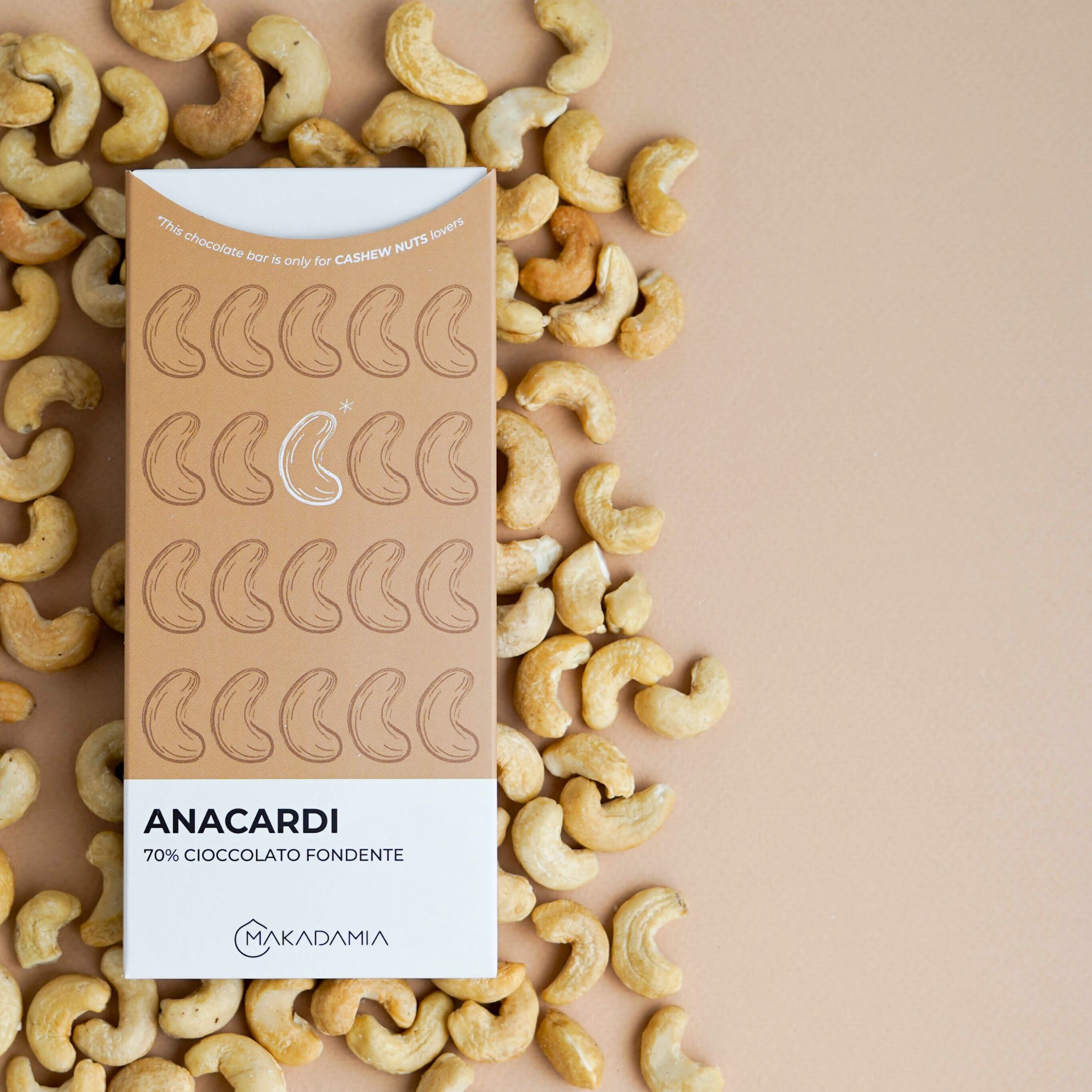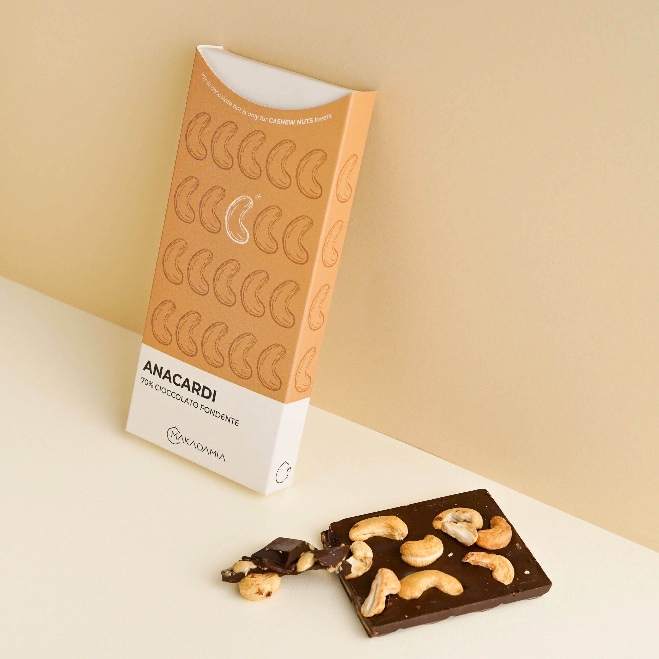 Ecco che sono così nate le nostre tavolette di cioccolato fondente al 70%, con cuore morbido ripieno della nostra crema 100% anacardi e il dorso croccante ricoperto con i nostri anacardi tostati.