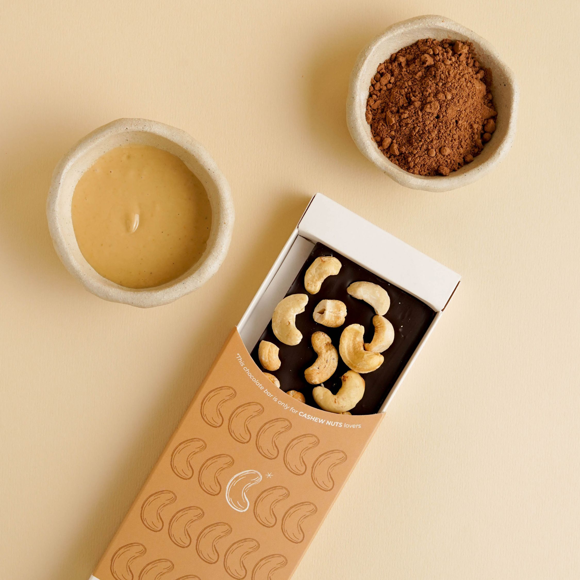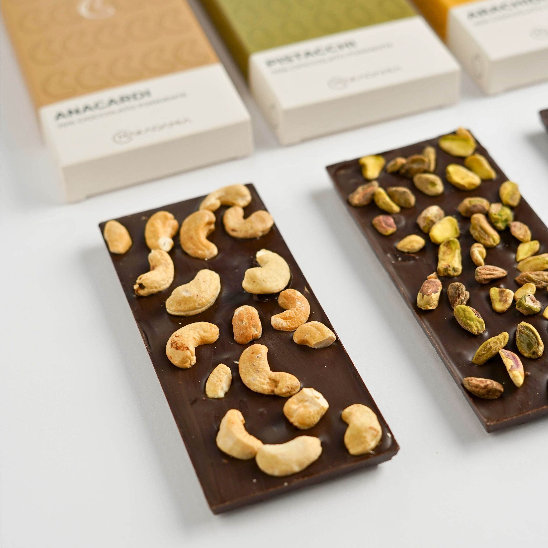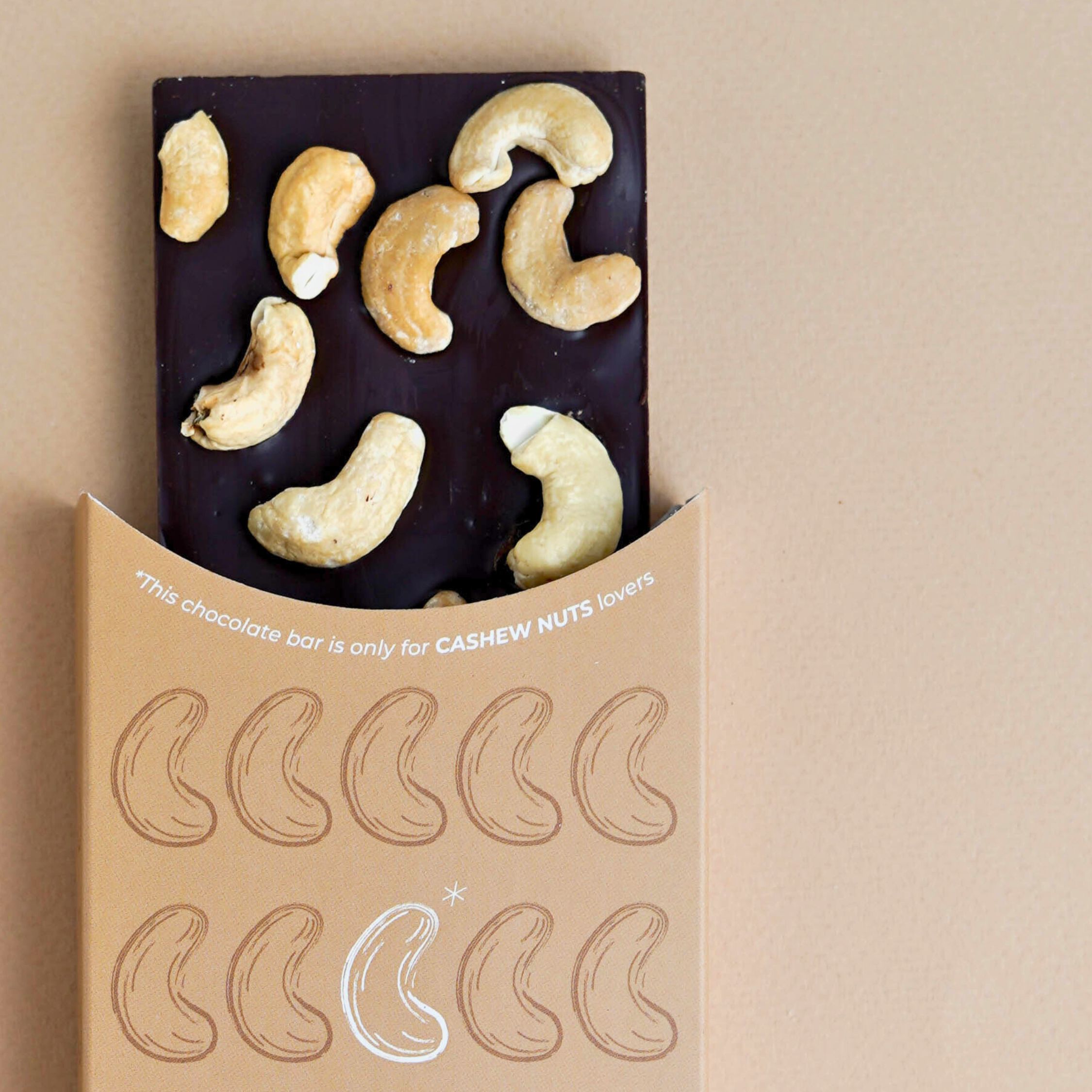 Ecco che sono così nate le nostre tavolette di cioccolato fondente al 70%, con cuore morbido ripieno della nostra crema 100% anacardi e il dorso croccante ricoperto con i nostri anacardi tostati.
